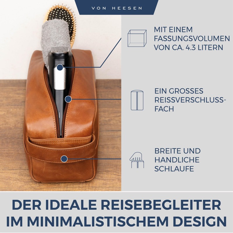 VON HEESEN Toiletry Bag Leather Toiletry Bag for Men and Women - Genuine Leather Necessaire Ideal for Travel - Wash Bag and Cosmetic Bag, Cognac Brown (Smooth), 1 main compartment