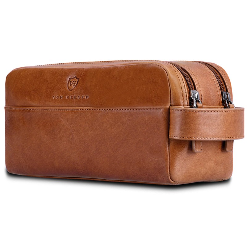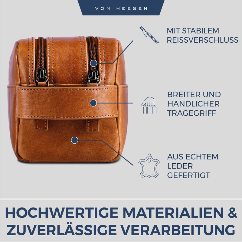 VON HEESEN Toiletry Bag Leather Toiletry Bag for Men and Women - Genuine Leather Necessaire Ideal for Travel - Wash Bag and Cosmetic Bag, Cognac Brown (Smooth), 2 main compartments