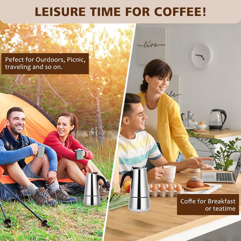 - Suitable for all Hobs:The Italian coffee maker is suitable for a variety of stoves including induction cooker (The minimum coil requirement for induction is greater than 95mm), ceramic stove, alcohol stove, stove gas, etc.Only 3-5 minutes, you can taste the rich coffee. Note: It is normal that the stainless steel turns black after use in the fire, it does not affect the use, it can be cleaned with a cleaner stainless steel