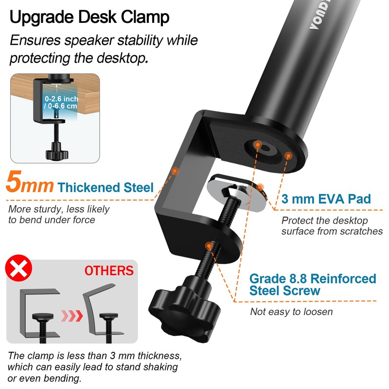 - Upgrade Desk Clamp: 3mm EVA pad on the clamp is helpful to protect the desktop surface from scratches. 5mm thickened clamps are stronger and less likely to cause deformation. Use grade 8.8 reinforced steel screws, not easy to loosen. Clamp adjustable range is 0-2.6 inches, fits most desktops with different thickness.