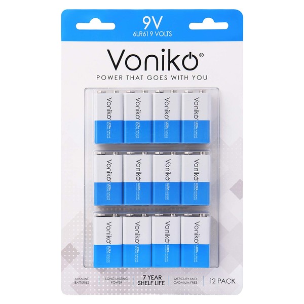 Voniko 9V Batteries - Alkaline 9V Battery 12 Pack - Ultra Long Lasting with a 7-Year Shelf Life