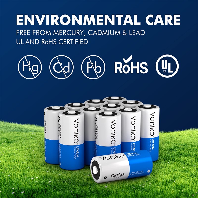 - Safer, Greener, Longer Lasting with UL, RoHS certified– Each VONIKO 3 volt cr123a battery is equipped with PTC protection including short circuit overcurrent protection and intelligent voltage surge safeguards, making VONIKO 123a batteries lithium ideal for high-drain devices.
