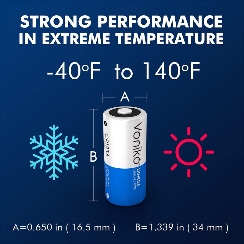 - Full 10-Year Shelf Life – Use them right away or store them for a future emergency – you can be sure CR123a non-rechargeable batteries will remain just as fresh as the day you got them up to 10 years from now. With extreme temperature operation, VONIKO = always ready to go. Store at around 68°F for best results.