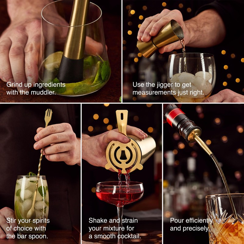 - PREMIUM STAINLESS STEEL: Rest assured that your cocktail making kit will withstand the most vigorous shaking. Not only is the steel construction durable, but it makes handwashing a breeze too.