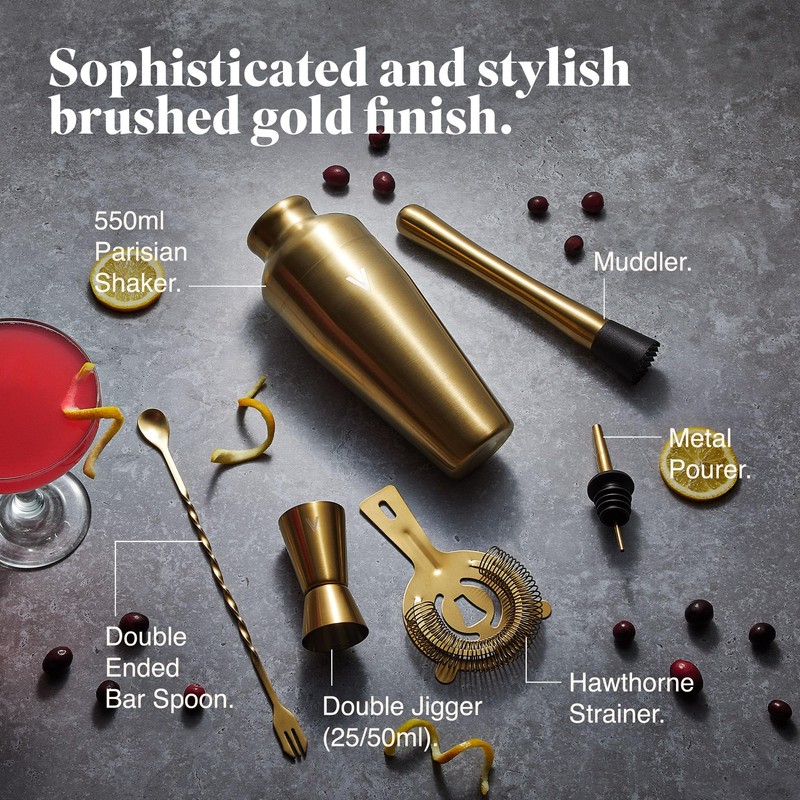 - SHAKE IN STYLE: Stir, mix, and shake to perfection with the VonShef 6pc Parisian cocktail shaker set. Featuring an elegant brushed gold finish, add a touch of sleek sophistication to your home bar today.
