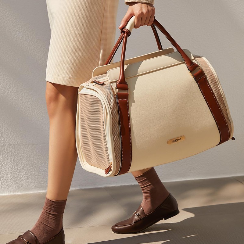 - Upgraded Exclusive Design: VOOCOO's airline approved pet carrier blends beauty with practicality, crafted from bite-resistant, scratch-resistant PU leather and waterproof canvas cloth. Designed to meet the daily travel needs of cats and small dogs, it combines style and functionality seamlessly.
