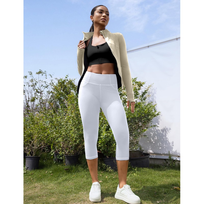 VOOVEEYA Capri Leggings for Women, High Waisted Yoga Pants with Back Pockets Crop Workout Capris Pants (Capri White M)