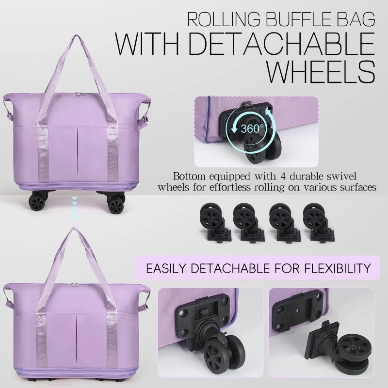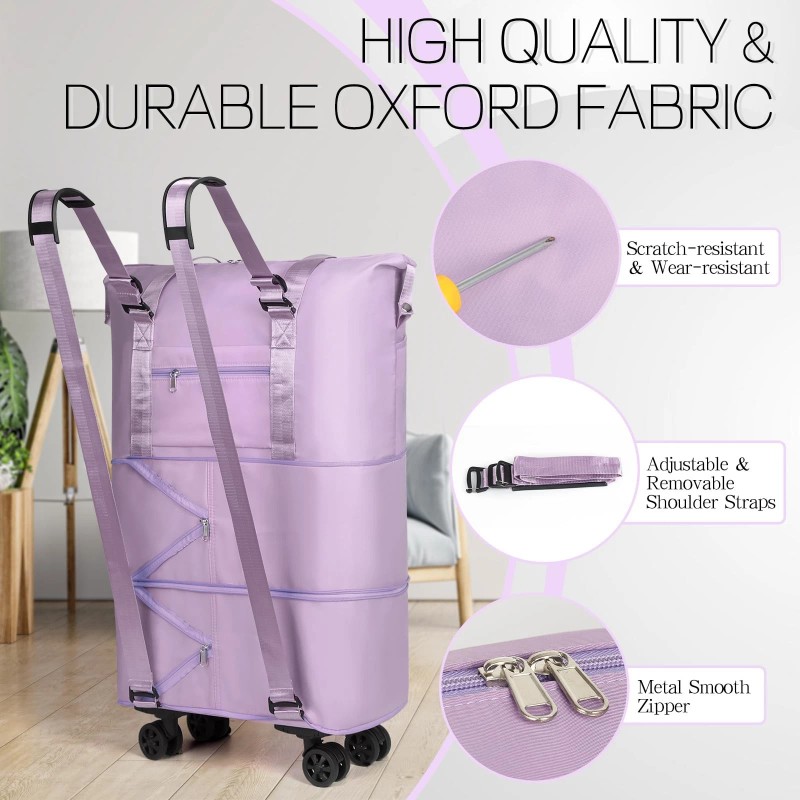 【Rolling Duffel Bag with Wheels & Rolling Backpack】This expandable foldable duffle bag for travel is crafted from thicker, scratch-resistant oxford cloth with stylish pattern, features removable shoulder straps that can be adjusted between 26-44inch in length, allowing seamlessly convert between carry on tote bag with luggage sleeve, rolling duffle bag with wheels, and large travel backpack. Its expandable capacity by 2 layers is with larger dimensions compared to standard market offerings