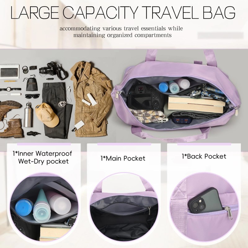 【Large Duffle Bag for Travel】 The weekender bags has 1 main compartment with 1 inner zip wet pocket, and 1 back luggage sleeve pocket, This carry-on bag is designed without a rigid structure, it cannot stand upright when empty and requires proper packing to hold its shape. For better stability, we recommend placing heavier items at the bottom when packing to maintain balance, avoiding top-heavy loads to prevent tipping and distributing weight evenly for better balance