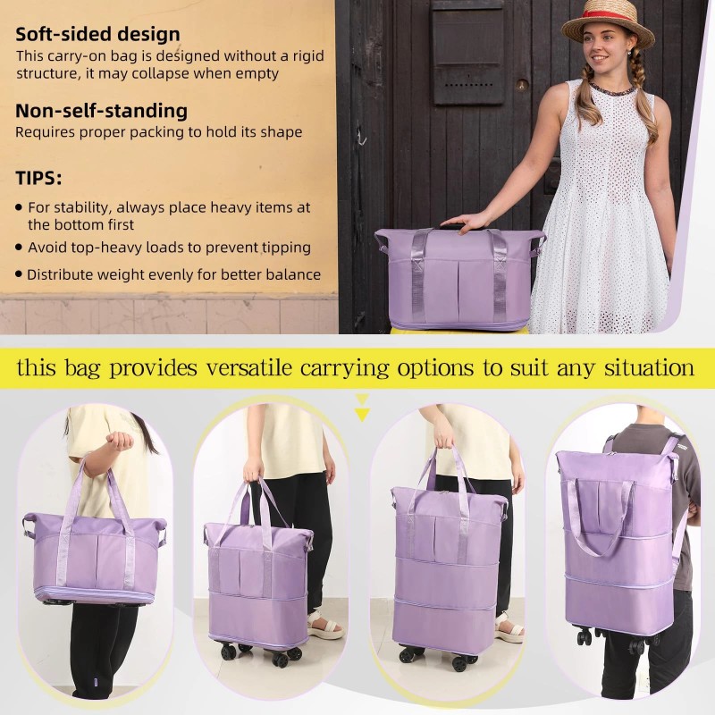 【Rolling Duffel Bag with Wheels & Rolling Backpack】This expandable foldable duffle bag for travel is crafted from thicker, scratch-resistant oxford cloth with stylish pattern, features removable shoulder straps that can be adjusted between 26-44inch in length, allowing seamlessly convert between carry on tote bag with luggage sleeve, rolling duffle bag with wheels, and large travel backpack. Its expandable capacity by 2 layers is with larger dimensions compared to standard market offerings