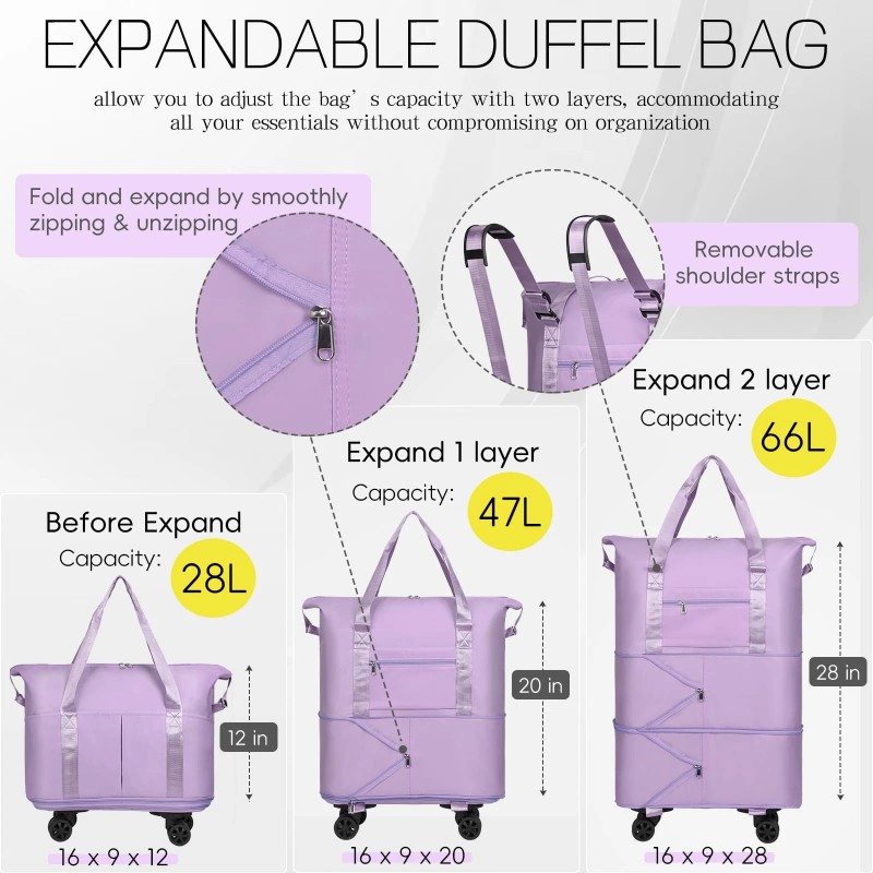 【Foldable & Expandable Duffle Bag with wheels for Travel】This expandable luggage bag for travel has two zippers at the bottom. You can open or close the zippers at the bottom of the rolling duffle bag to increase or decrease the capacity, normal size is 16 x 9 x 12 inch, expand the first layer increases the height to 20inch, and second layer to 28inch, this travel bag with wheels can expand from 28L carry on bags for airplanes to a 66L large duffle bag, adjust your storage space as needed