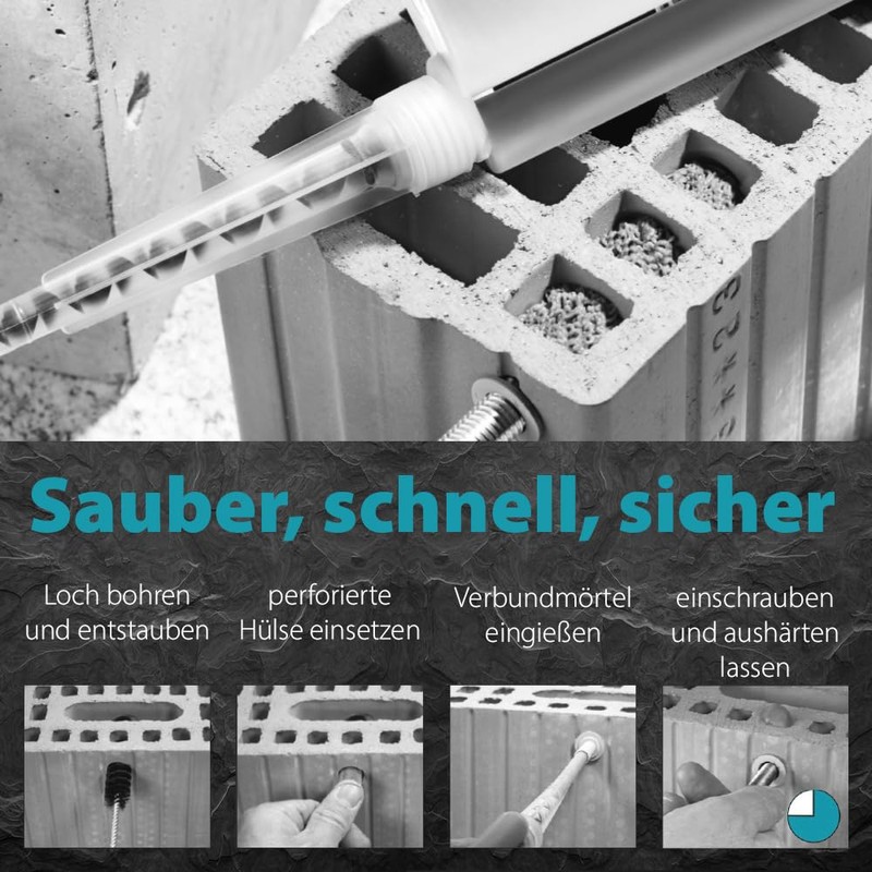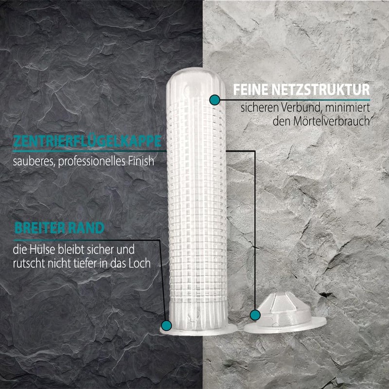 - Maximum stability - The sieve sleeve improves grip by evenly distributing the composite mortar when screwing in the threaded rod. This ensures a strong, durable bond with the surrounding material.