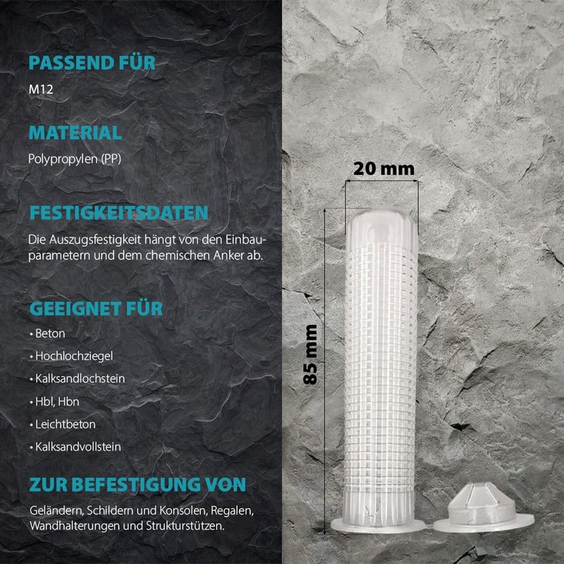 - Technical data: size: 20 x 85 mm, for M12. Material: Polypropylene (PP). Strength data: the pull-out strength depends on the installation parameters and chemical anchoring. Suitable for concrete, perforated bricks, sand-lime brick, Hbl, Hbn, lightweight concrete, sand-lime brick. Used to fix railings, signs and consoles, shelves, wall brackets and structure supports.