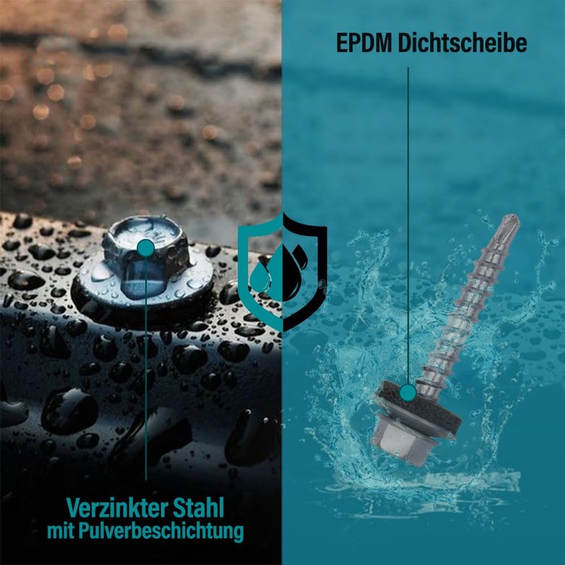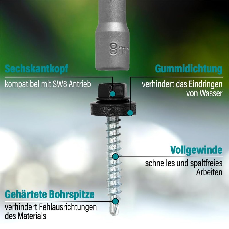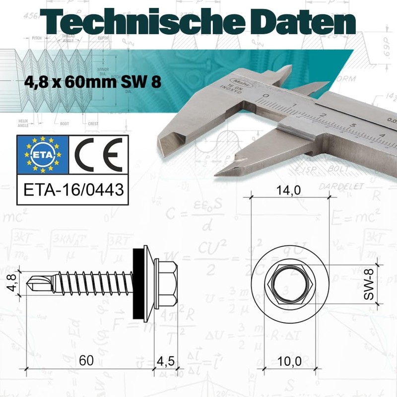 • Technical details: self-cutting drilling screws with ETA approval: dimensions: 4.8 x 60 mm, wood thread, quantity: 50 pieces, drive: SW8 hexagonal head. Colour: RAL9005 deep black. Material: high-quality steel with galvanised zinc layer and 14 mm rubberised washer (EPDM sealing ring).