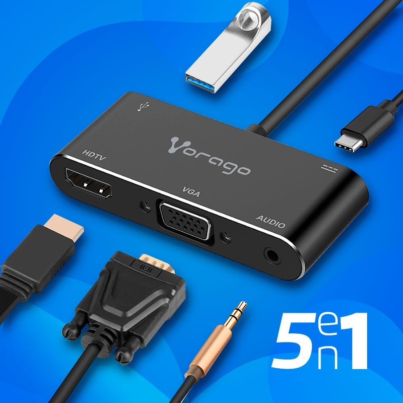 Vorago ADP-350 Adaptador Tipo C 5 en 1, HDMI, VGA, 3.5 mm, USB C y USB 3.0