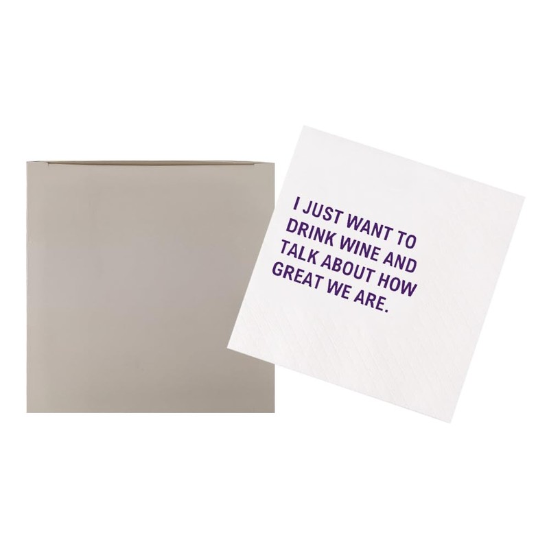- Featuring the witty quote "I just want to drink wine and talk about how great we are," these napkins add a fun, light-hearted touch to any celebration.