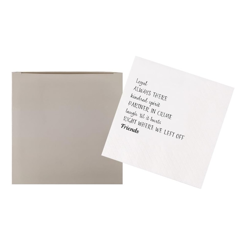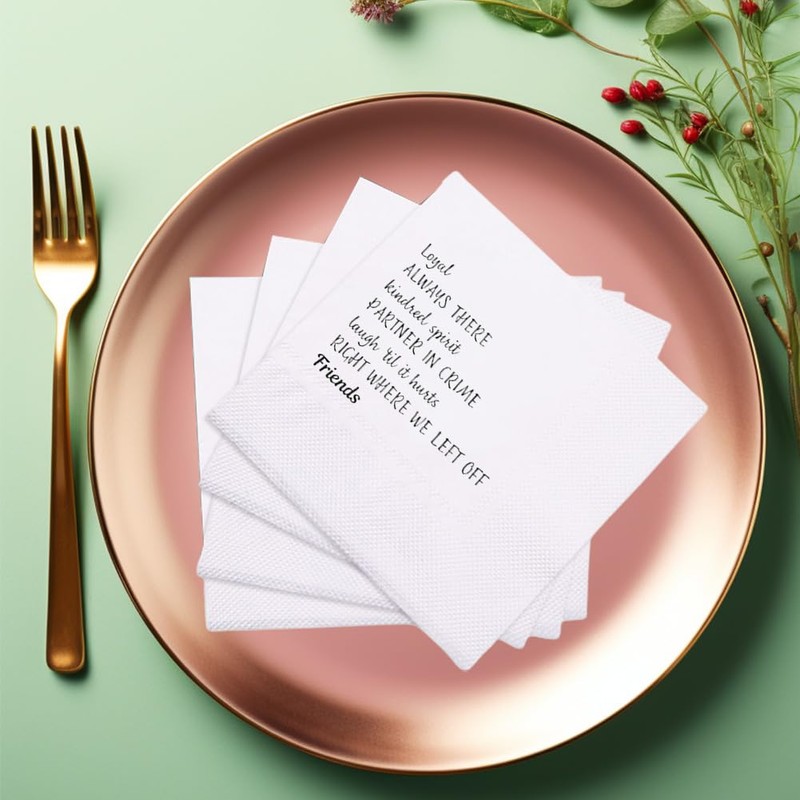 - Featuring the humorous quote "Loyal, always there, kindred spirit, partner in crime, laugh till it hurts, right where we left off," these napkins celebrate the joy of true friendship.