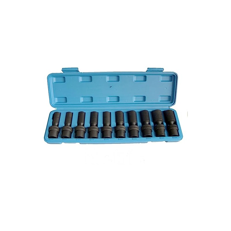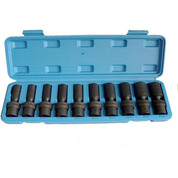 Top Quality 10 Piece Deep Impact Socket Set With Universal Head In Metric. Fits All 3/8" Square Drive With Carrying Case Included. Drop Forced & Heat Treated Chrome Molybdenum Steel. Radius Corner Design Contacts Only Flat Surface To Eliminate Rounding Off Corners Of Fastener Head. Contents : 10,11,12,13,14,15,16,17,18,19 mm