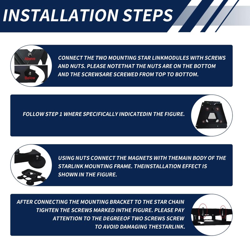 - Easy to install: All you need to do is connect the Starlink Gen 3 to the Metal Bracket with screws and nuts, then link the four magnet bases to the Metal Bracket, and then the entire onboard Starlink mounting bracket is complete