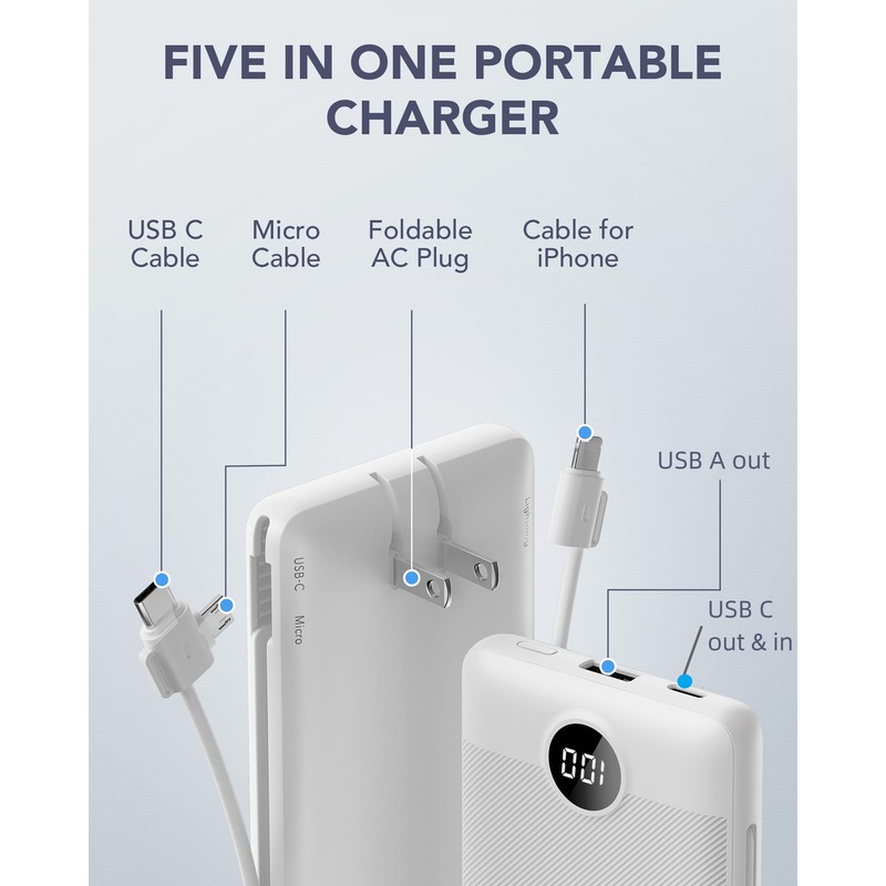 - [Portable Charger With Built-in Cables & AC Wall Plug] Not only it has a built-in Micro cable, USB C cable, and other charging cable for iPhone, but also is equipped with a USB port,and USB C port. Also, Portable phone charger is built-in wall plug that charges the power bank itself directly from the wall outlet.