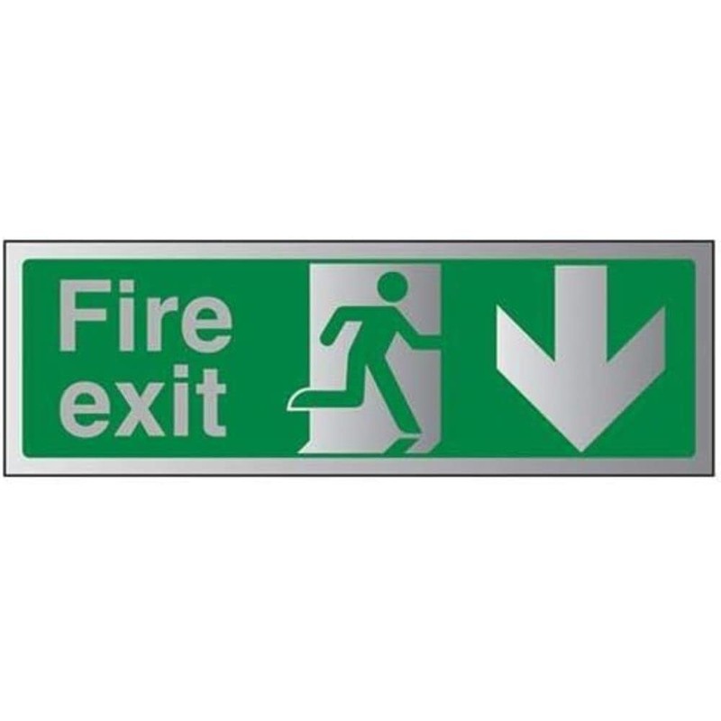 VSafety Fire Exit-Fire Exit Arrow Down Sign - 300mm x 100mm - 3mm Brushed Alu Comp