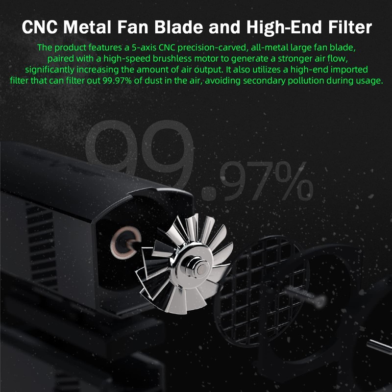 - Precision Engineering with CNC Fan Blade and Elite Filter: Featuring a 5-axis CNC precision-carved, all-metal fan blade and a high-speed brushless motor, this air blower generates an even more robust airflow. Paired with a top-tier imported filter that captures 99.97% of airborne particles, it ensures pure air output, preventing any secondary pollution.