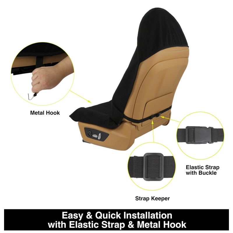- Airbags & Armrests Compatible: The cover is designed to fit car seats with built-in airbags, armrests, and seat belts. It won't prevent you from fastening your seat belt or adjusting your electric car seat. Measuring 29.5” x 56” with adjustable elastic strap, it’s designed to fit both front seats and rear seats for most Cars, SUVs, Vans, and Trucks securely. Ideal for both leather and fabric car seats.