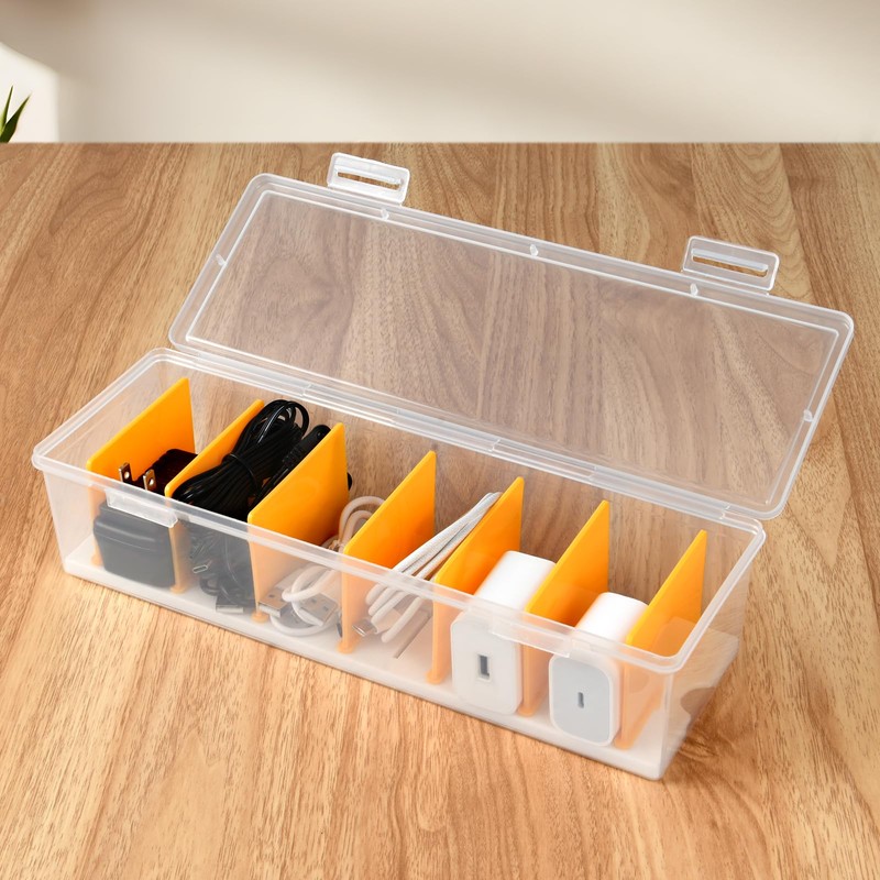 vsshe Transparent Cable Organiser with Lid, Cable Organiser Box, 7 Compartments & Removable Dividers, Cable Storage Box - Storage Box for Charging Cables, Chargers, Desk Accessories