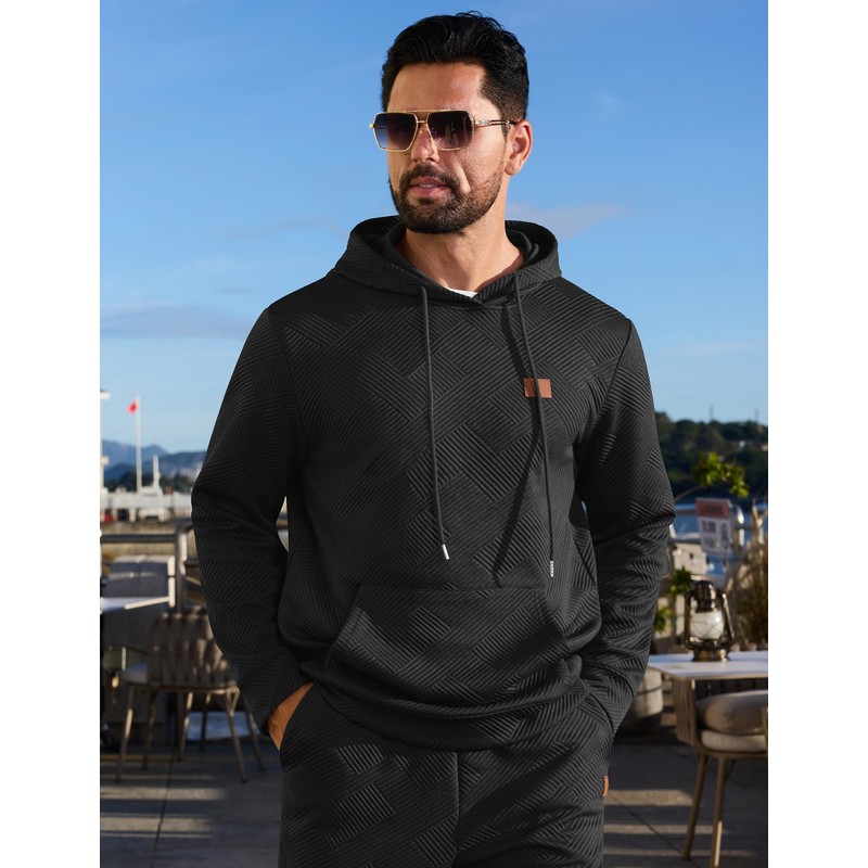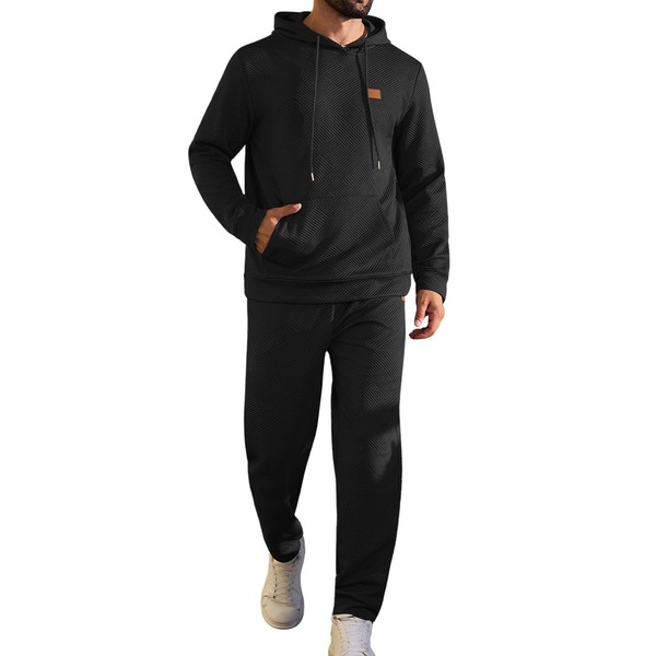 - Stylish & Practical Design: This men's tracksuits 2 piece set features jacquard texture and a small blank leather square that adds sophistication.It's including hoodie and sweatpant. Drawstring hooded pullover with kangaroo pocket; pants with an elastic waistband and drawstring for a perfect fit, while 2 side pockets add a touch of practicality.