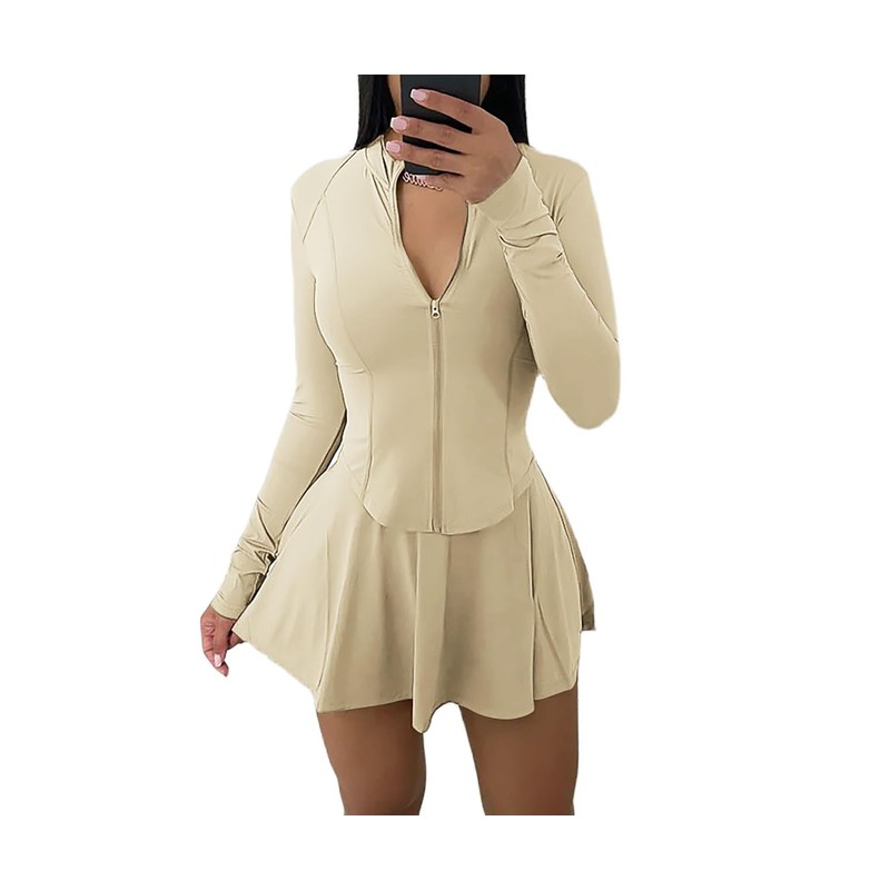 Vssjavun Women 2 Piece Mini Skirt Sets with Long Sleeve Zipper Workout Jacket Sweatsuit Tracksuit Tennis Outfits Going Out Sets Nude S