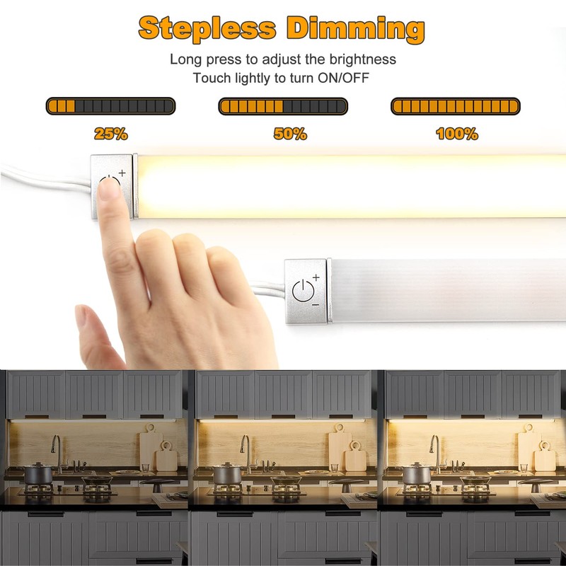 - 【Dimmable】---Touch dimmer switch,freely 0%~100% stepless dimming.Lightly touch to turn ON and OFF,long press to adjust the brightness.