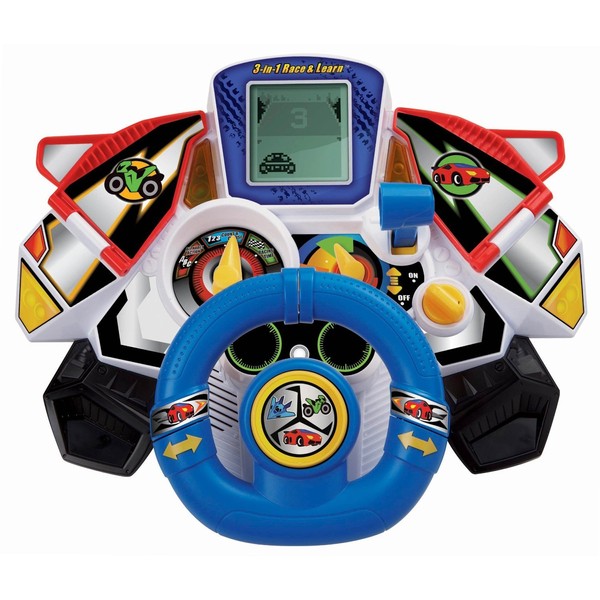 Exciting missions await with the 3-in-1 race & learn by VTech. The 3-in-1 driving console features three modes of racing play. Switch from car to jet to motorcycle as your child learns letters, phonics, spelling, numbers and more. Race on nine different courses with this fun learning toy as vibration effects simulate real driving sensations for a role-play adventure.