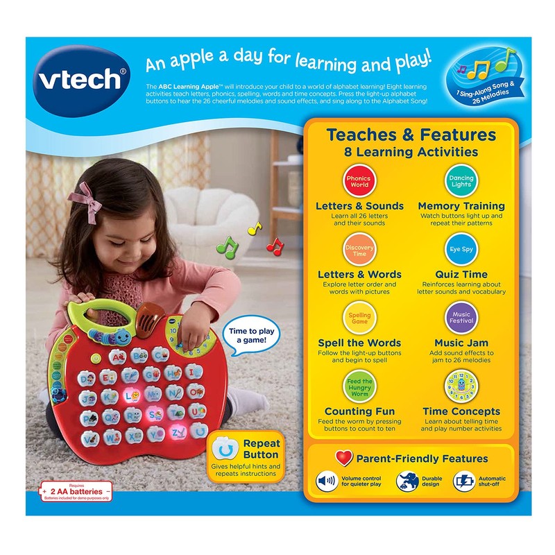 Pick up the ABC Learning Apple? for an apple a day of learning and play! Twenty-six easy-to-press letter buttons on this interactive learning toy teach the alphabet sequence, phonics sounds, letter names and spelling, and play melodies and sound effects. Keep children interested and challenged with progressive learning levels. Start in Phonics World to hear letter sounds, then switch to Discovery Time to learn about words and letter order. Follow the light-up buttons to practice spelling with the Spelling Game. Move the worm clock hand around the play clock to explore time concepts, then switch to Feed the Hungry Worm to practice counting. Ready to practice memory skills? Turn on the Dancing Lights game and try to repeat the light-up patterns on the apple. Go to Music Festival when youre ready to get up and dance! Find out what youve learned by quizzing yourself in Eye Spy. This educational apple helps preschoolers get ready for school. Bring this portable toy anywhere for bushels of fun and learning on the go! Intended for ages 2-5 years. Requires 2 AA batteries. Batteries included for demo purposes only. New batteries recommended for regular use.