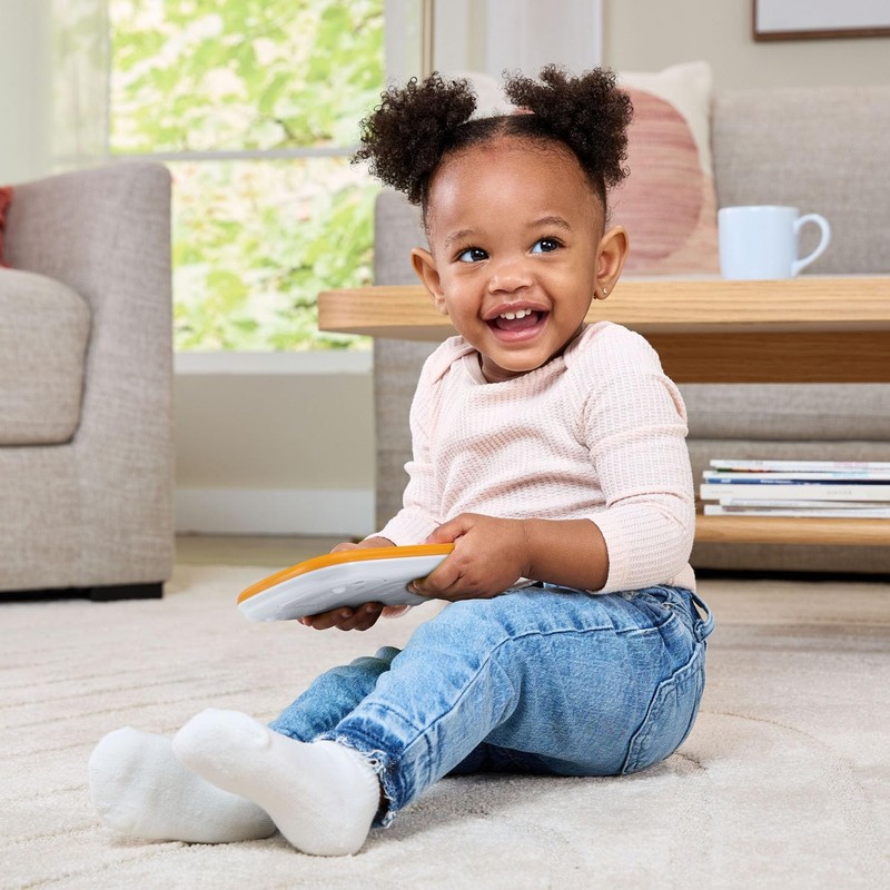 Today is a great day for play, according to the weather app on this first tablet for little ones. Check email or the weather, play music and say hello to animal pals by pressing the colorful light-up buttons on this perfectly portable toy. Hear age-appropriate vocabulary including animals and numbers through phrases and sing-along songs. Flip the switch to choose between English and Spanish. Use the directional button to create a light show by moving it up, down, left or right to draw little ones further into the excitement. Intended for ages 9-36 months. Requires 2 AAA batteries. Batteries included for demo purposes only. New batteries recommended for regular use.