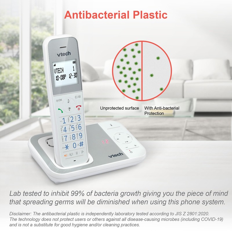 - Antibacterial plastic*** & Easy to Clean Design - Lab tested to inhibit 99% of bacteria growth giving you the piece of mind that spreading germs will be diminished when using this phone system. The seamless and smooth handset and base design makes cleaning and disinfecting easier while also reducing dirt and germ crevices.