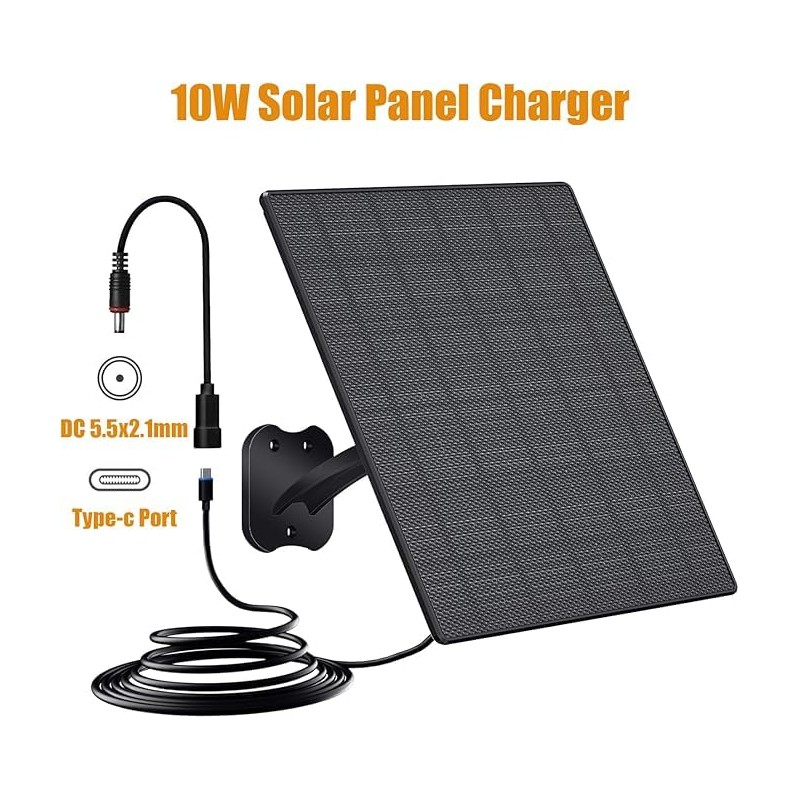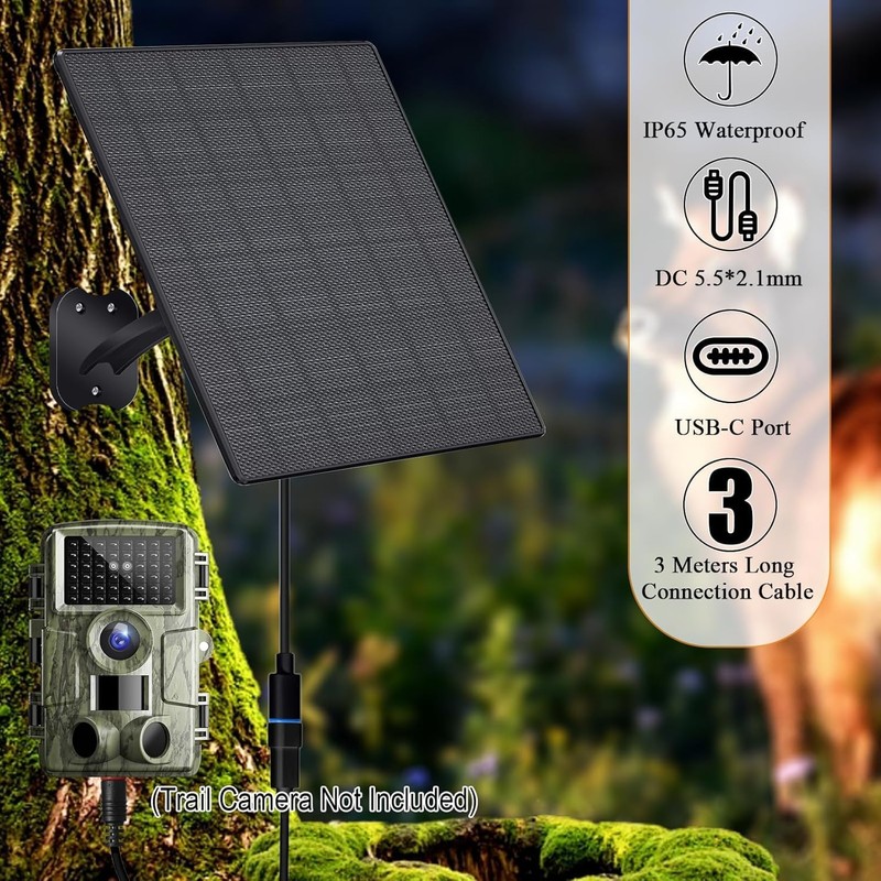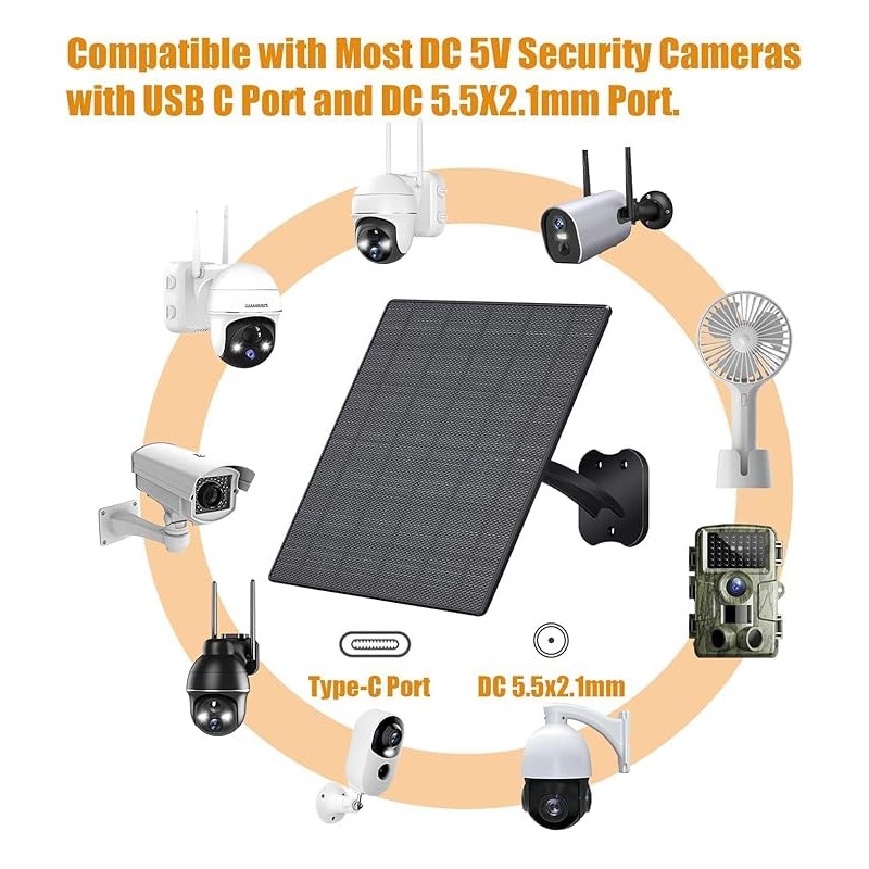 - COMPATIBILITY: Our 10W hunting camera solar panel is compatible with most DC 5V security cameras with USB C port, Micro USB port and DC 5.5x2.1mm port. Therefore, it enhances the compatibility of the solar panel to charge a wide range of devices such as outdoor security cameras, which has more compatibility than other solar panels.