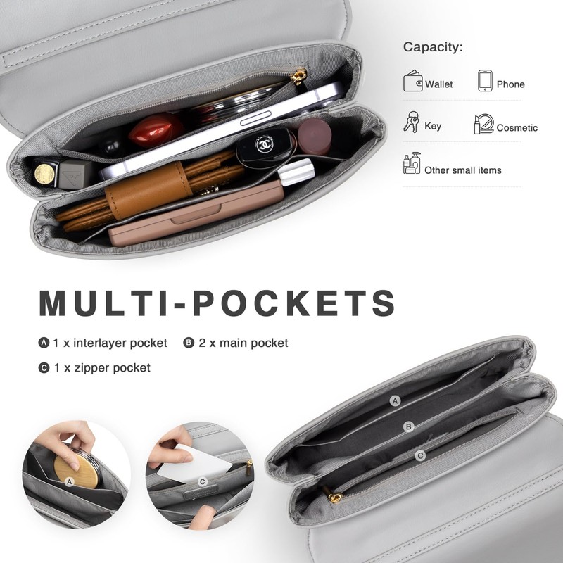 - LARGE CAPACITY: You can carry your cell phone, wallet, keys, cosmetics, small mirror, and some other daily necessities. The interior consists of 2 main compartments with a zippered inner pocket on both sides and an interlayer pocket. This bag is equipped with a strong magnet snap closure, easy to open and securely closed, things will not fall out.