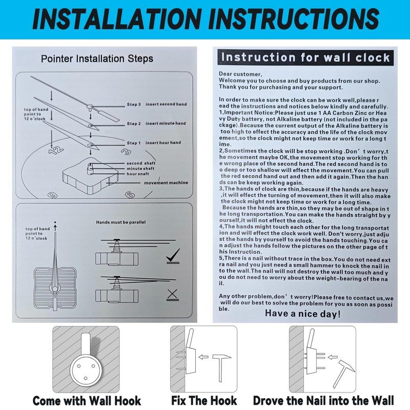 - Easy Installation: Includes one 12-inch wall clock, 1 instruction manual and 1 wall hook (battery not included). Only need 1 AA battery to operate. Simply connect the positive/negative poles as illustrated. Quick installation and immediate use