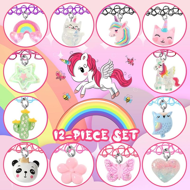 VURYAPI 12 Piece Choker Necklace Set for Children Teens Girls Women Pendant Charm Unicorn Rainbow Panda Cat Heart Flower Mermaid Chokers Henna Tattoo Stretch Elastic