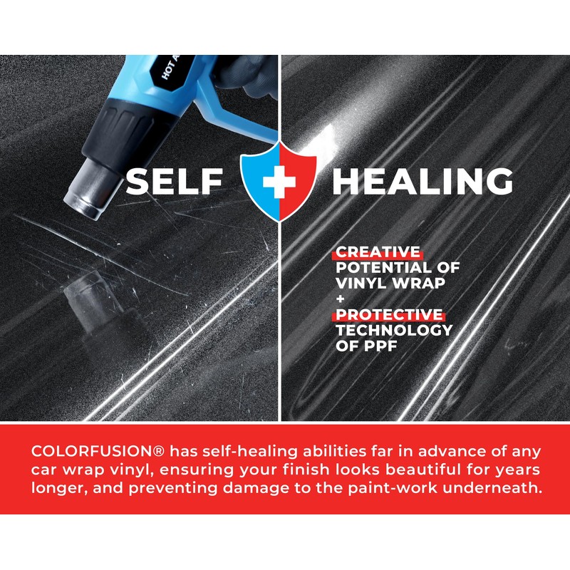 • Exceptional Self-Healing: ColorFusion has self-healing abilities far in advance of any car wrap vinyl, ensuring your finish looks beautiful 2 x longer than other wraps, and preventing damage to the paint-work underneath. Gently apply heat with a heat gun, and watch your ColorFusion wrap heal from scratches that would spell the end for any other film.
