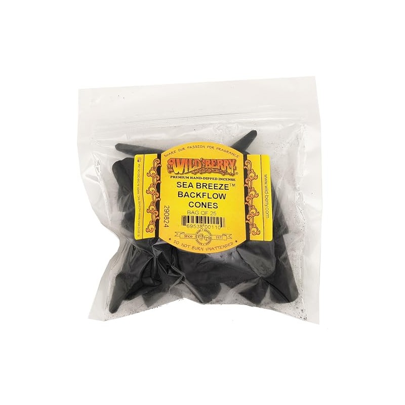25 hand-dipped Sea Breeze backflow incense cones, the smoke flows downwards in a backflow burner! A crisp clean scent with fresh notes of sparkling lemon, watery jasmine, sun-drenched oak moss and powdery musk.