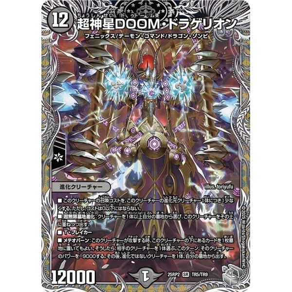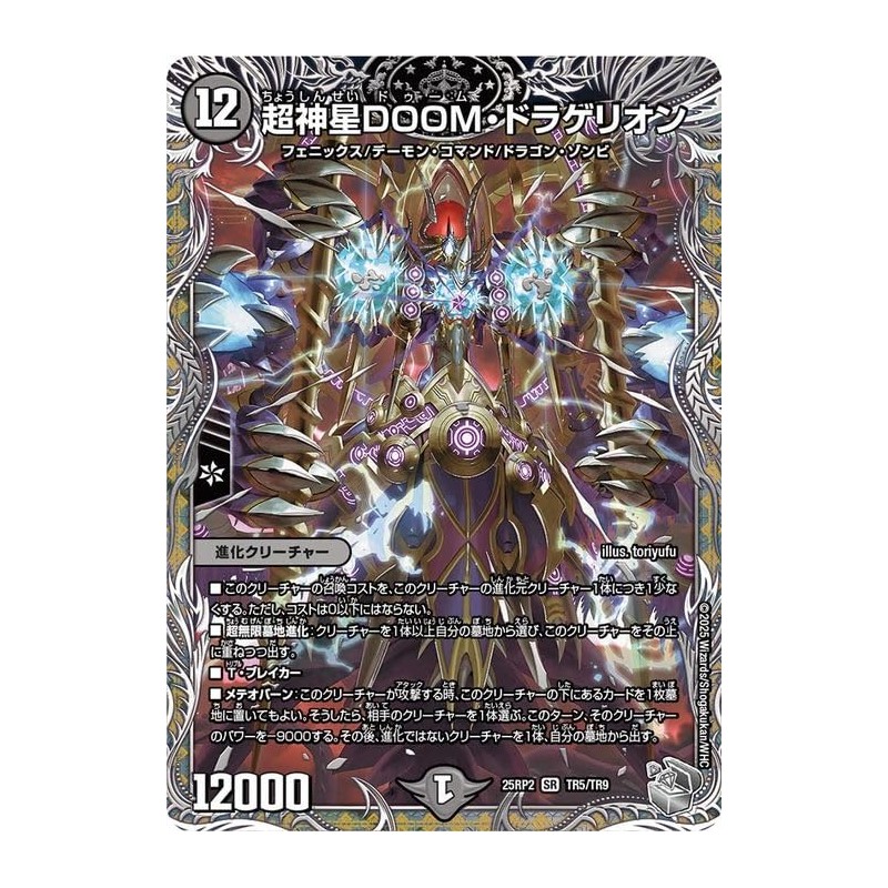- デュエル・マスターズTCG 王道W 第2弾邪神vs邪神II ~ジャシン・イン・ザ・シェル~」(DM25-RP2)収録 ■カード名:超神星DOOM・ドラゲリオン ■Card Name:Supernova DOOM Dragerion ■レアリティ:銀トレジャー ■種類:進化クリーチャー ■文明:闇文明 ■種族:フェニックス/デ