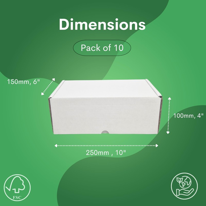 - White box mailers sized 250mm x 150mm x 100mm are ideal for shipping delicate items, while also presenting a professional appearance. These postage boxes are shipped flat-packed and are easy to assemble.