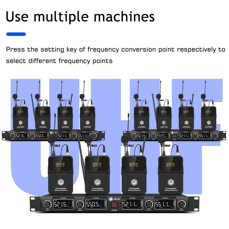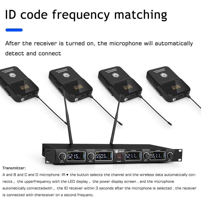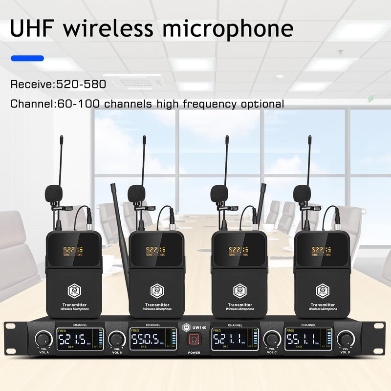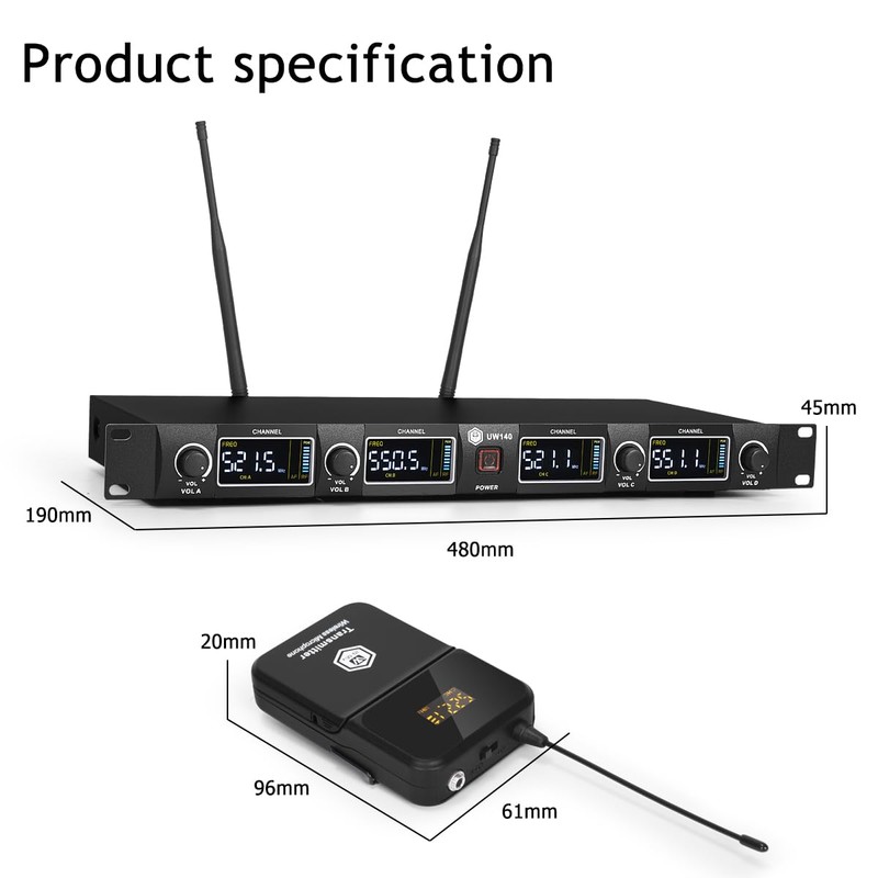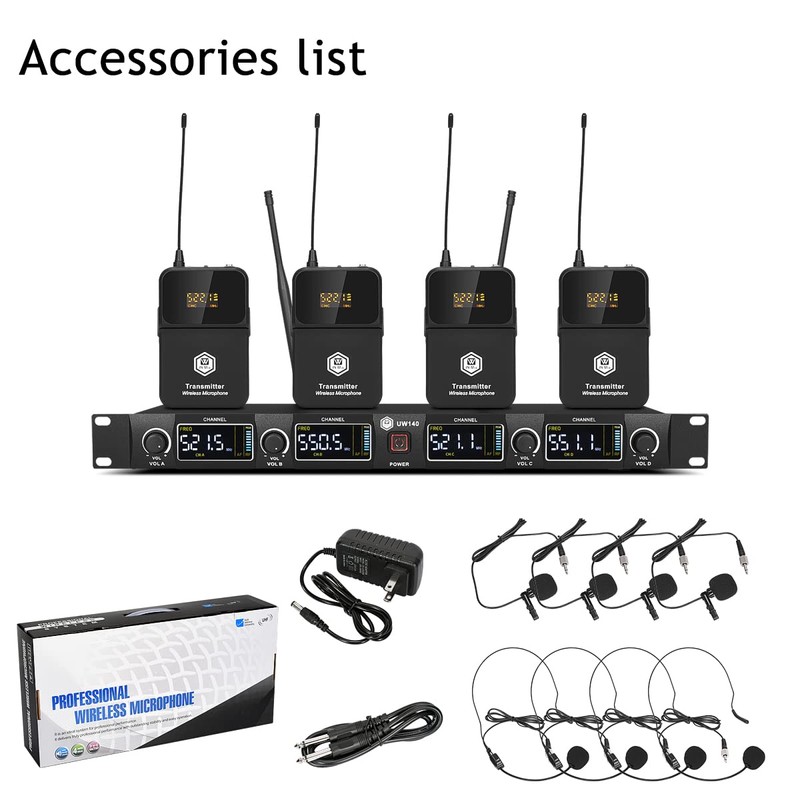 - BOX CONTENTS: 1 four-channel wireless metal receiver, 4 UHF bodypack wireless, 4 black headset microphones,4 black lapel lavalier microphones, 1 power adapter, 2 antennas,1 user manual