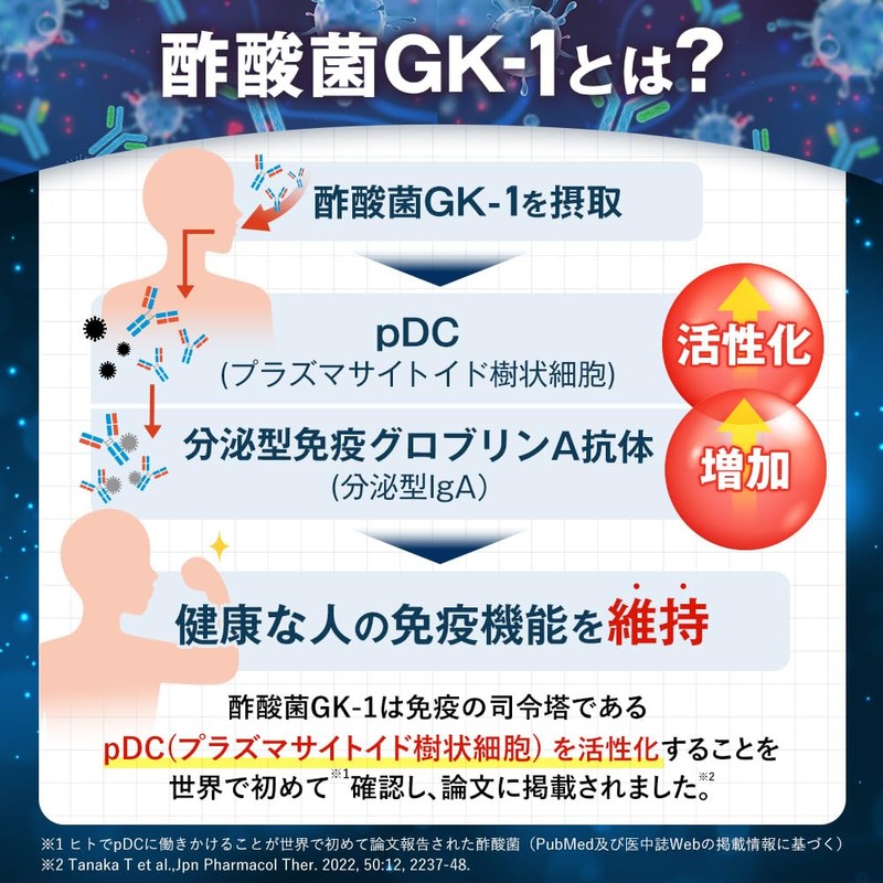 - ✅ 【世界初※!pDCに働きかける酢酸菌】 酢酸菌GK-1は、免疫の司令塔と呼ばれるpDC(プラズマサイトイド樹状細胞)を活性化することを世界で初めて確認し※論文に掲載されました。※ヒトでpDCに働きかけることが世界で初めて論文報告された酢酸菌(PubMed及び医中誌Webの掲載情報に基づく)