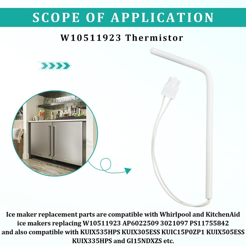 Thermistor information: W10511923 thermistor, compatible with Whirlpool, KitchenAid and Kitchenade ice makers, replacement for W10511923, AP6022509, 3021097, PS11755842, can be the perfect solution for ice makers that make too much ice Ice Sensor Function: monitors the temperature inside the ice maker storage fridge and sends the temperature reading to the electronic control board to maintain precise temperature control for consistent production of high quality ice. Wide range of compatibility: Ice maker replacement parts are compatible with Whirlpool and KitchenAid ice makers, replacing W10511923, AP6022509, 3021097, PS11755842, and also compatible with KUIX535HPS, KUIX305ESS, KUIC15P0ZP1, KUIX505ESS. KUIX335HPS and GI15NDXZS etc. Excellent performance: The outer layer of W10511923 thermistor is made of high quality resin, which is waterproof, not easy to break, wear-resistant and has a long service life. Easy to install: the installation of thermistors for ice machines is very simple, no need to spend money on hiring a service technician, just use a simple 1/4-inch nut driver can easily solve your problem, greatly saving your time and energy!