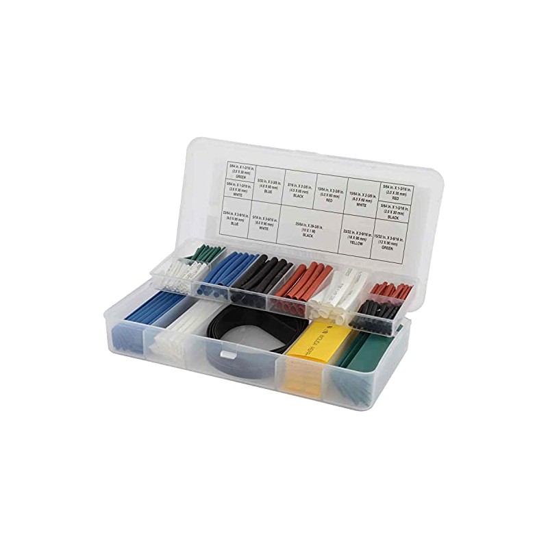 Includes:Clear Plastic Case Heat shrink assortment includes various colors, diameters, and lengths; from 1-3/16" to 39-3/8". They have a 2:1 shrink ratio and come in a two-tier folding case for great organization and storage.Features:Various colors, diameters, and lengths1-3/16" to 39-3/8"2:1 shrink ratiotwo-tier folding case