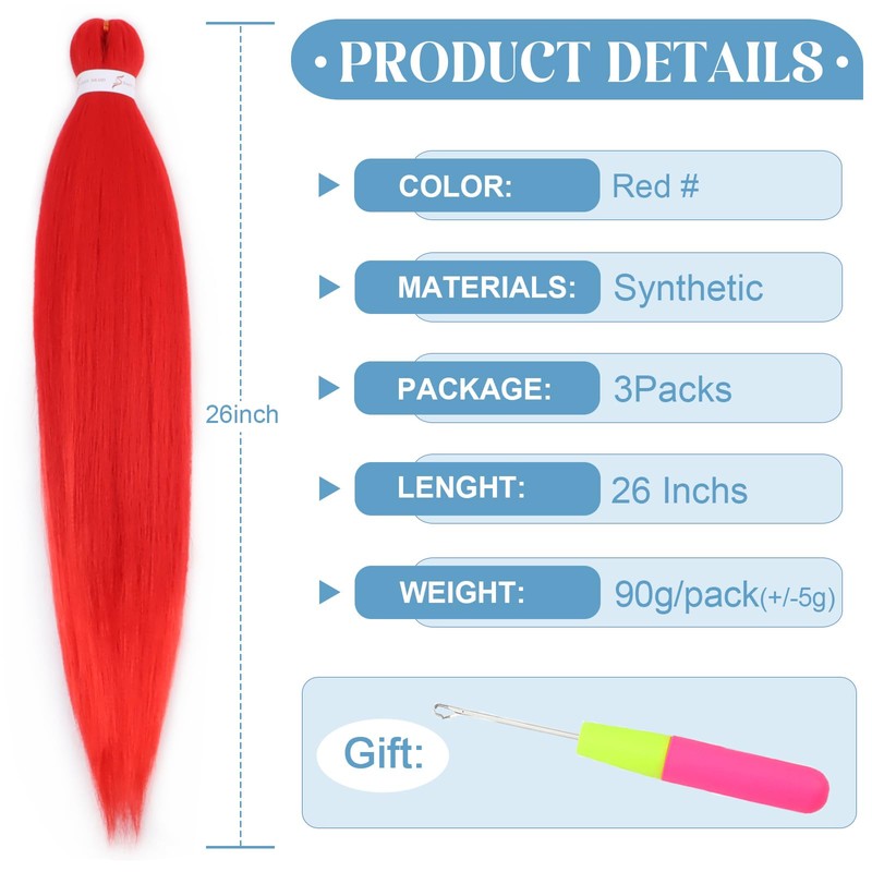 WacanDan Red Braiding Hair Pre stretched 26 Inch 3 Packs, Professional Soft Yaki Texture Long Braid Extensions, Hot Water Setting for Box Braids Twist & Crochet Braids