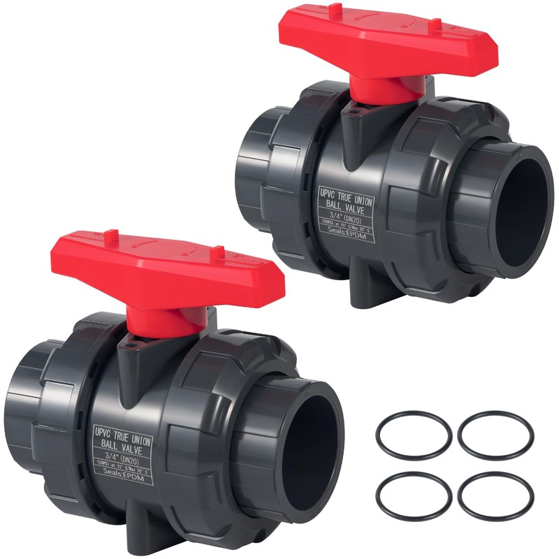 Wacjak 3/4" PVC True Union Ball Valve 2 Pack with Full Port Industrial Grade EPDM O-Rings Reversible PTFE Seats PVC Material for Water System
