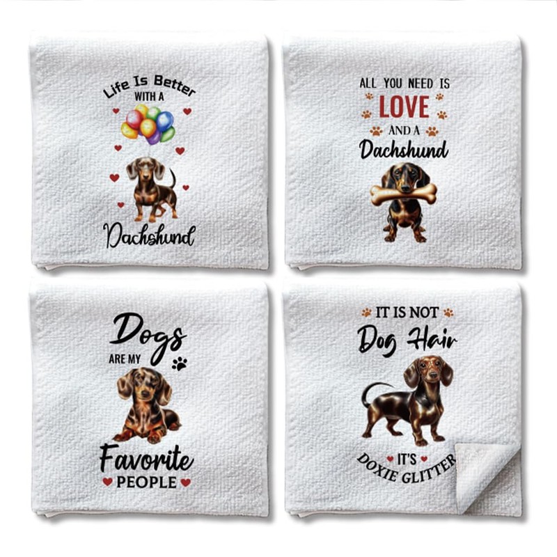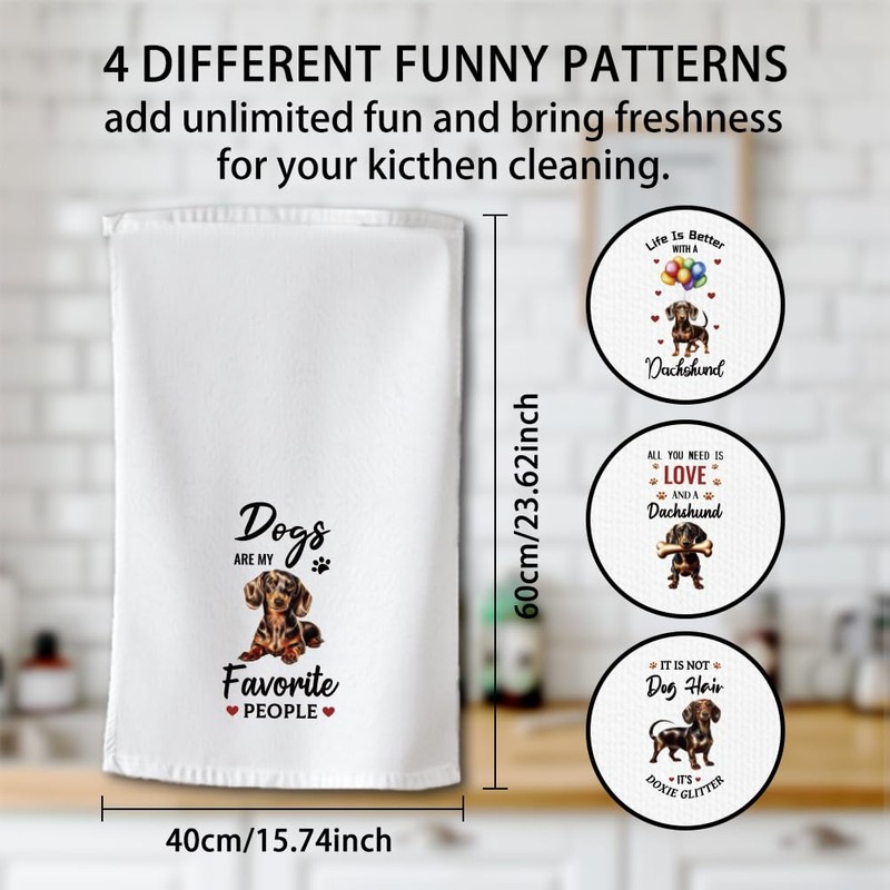 WADORN Pack of 4 Funny Dachshund Towels, Kitchen Tea Towels with Weiner Puppy Dog 60 x 40 cm Microfibre Absorbent Soft Hand Tea Tea Towels for Cooking Baking Bathroom Holidays